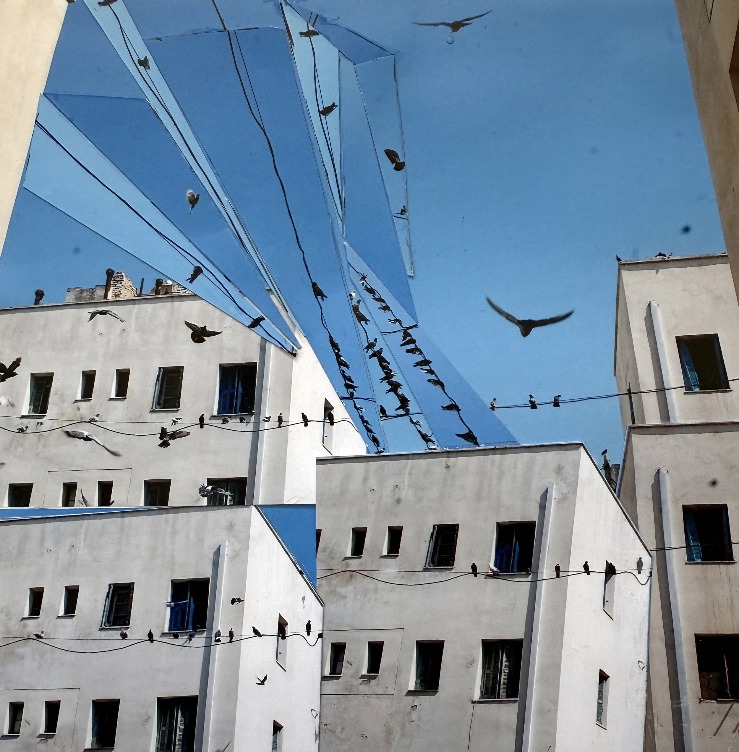 If they ask you, tell them we were flying / Flights is a series of photographic collages made from original urban landscape photographs that are printed, cut, and hand-assembled without digital intervention. The photographs used in the collage series were made in the Athens neighborhood of Dourgouti, where a settlement was created to accommodate Greek refugees arriving in Athens from Asia Minor in the 1920s. The project is a meditation on how imaginative and political possibilities can take form within marginalized urban spaces – and how these landscapes can be sites of flight and freedom-making. The photocollages develop a new visual vocabulary for considering liberation practices – inviting reflection on how we might expand our sense of what is possible, grounding ideas of freedom, joy, and flight in how we choose to live and create.