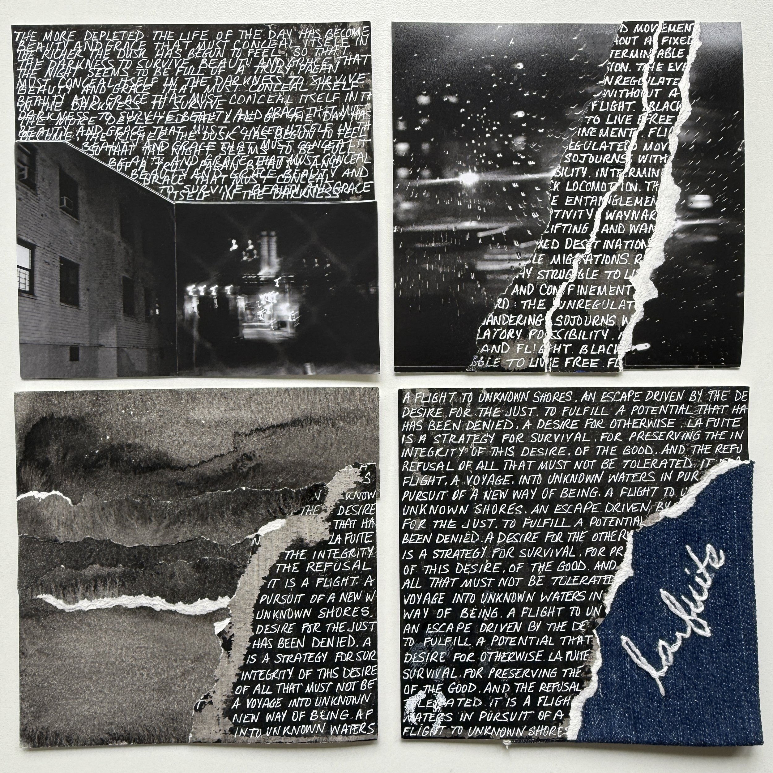 The Kites series refers to the notes that are the primary written method for imprisoned people to “fly” a message from one person to another secretly. It is in this clandestine making of an object for connection, and in underground networks of communication, that the project rests. The work is concerned with how creative practices are used as means of survival, and how spaces of enclosure are transformed into spaces of fugitive praxis through these practices of freedom.